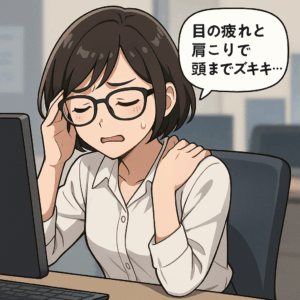 長時間の画面作業で目の筋肉が緊張すると、その負担は首や肩に広がります。