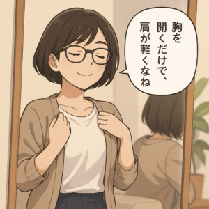 「胸を開く=肩をゆるめる」です。姿勢を戻すより、呼吸を広げましょう。